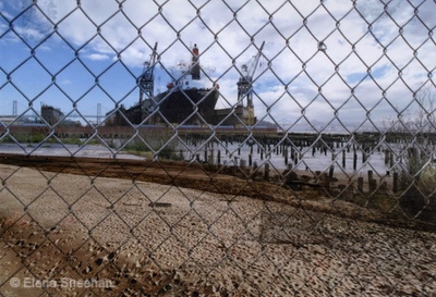 Shadows of the Past Image #19 In 2005, a friend directed me to Pier 70, which was being dismantled. He knew I would be interested in the area, even though it was not the kind of subject matter that usually appealed to me. I photographed that area for several years, and then I presented my work to the Port Commission. They put me on their mailing list and invited me to all the guided excursions to the fenced-off areas of Port 70. I had a box full of pictures of that area but never got around to trying to show the work, since it was not my usual "personal and intimate" subject matter. Recently I pulled out the box of Pier 70 pictures and decided to put them to use in some new way. I printed color transparencies of some of my nature images and layered them over the original Pier 70 pictures. I was amazed at how the layering transformed the original images. The added bit of nature (water, clouds, sky, grasses) gave the static pictures of decay a new life. I felt the pictures were in flux and changing before my eyes. We all hear a lot about climate change and how it is affecting everything and everyone. I had just finished reading The Sixth Extinction by Elizabeth Kolbert and felt my pictures were both shadows of the past and reflections of the present. Images are sequenced and printed into a book, Shadows of the Past. - Elena Sheehan