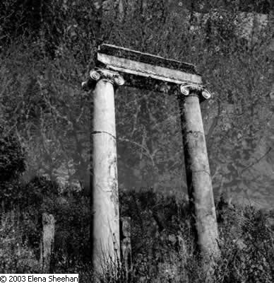 Antiquities Transformed Series Image #6 Since 1983 I have been interested in how images work together. In my book, Journey Through Seven Circles, I presented 35 images in seven metaphoric sequences. Since then I have been working with the idea of layering one image over another One image is superimposed directly onto the next in the camera, intentionally yet intuitively. This results in the destruction of a traditional form and the production of a new fluid reality. The subject is projected into a space of its own. Time past and time present are blended into organic movement that produces a continual inward and outward flow. All is in constant motion. Change is the only given. These images are from a body of work on ancient ruins found in Greece and Turkey. All but a few are multiple exposure. They are about spirit. By showing the subject in the context of its' own metamorphoses the photographs address the mystery, poetry and fantastic presence of the sacred in the world. - Elena Sheehan