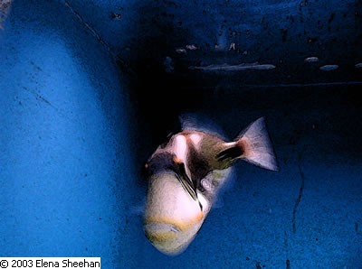 Fish Image #12 When I moved back to San Francisco in 1999, I gave up my darkroom. For many years, I had been feeling uneasy about throwing chemicals into our waters. Since I felt this way, the loss of the darkroom became less poignant. Change is always good if one can grow from it. I took up the digital camera and the digital darkroom and began working with Photoshop™. I was amazed that I really enjoyed the process. One can make images in many ways. I was still photographing subject matter that evoked a response from me. Fish are elusive as they constantly move. They are beautiful in color and context, but since they are in constant motion, it is difficult to capture their absolute likeness. Actually, I was not interested in capturing their absolute likeness. I did not photograph with flash. Instead, I went with the flow of their motion. I was happy to record the shapes and forms that they produced as they swam across my field of view. These were then transformed as they were captured by the slow shutter speed of the camera. Once again, my subject matter reflected my ongoing interest in the fleeting and transient nature of reality. - Elena Sheehan