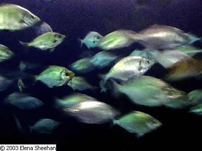 Fish Image #13 When I moved back to San Francisco in 1999, I gave up my darkroom. For many years, I had been feeling uneasy about throwing chemicals into our waters. Since I felt this way, the loss of the darkroom became less poignant. Change is always good if one can grow from it. I took up the digital camera and the digital darkroom and began working with Photoshop™. I was amazed that I really enjoyed the process. One can make images in many ways. I was still photographing subject matter that evoked a response from me. Fish are elusive as they constantly move. They are beautiful in color and context, but since they are in constant motion, it is difficult to capture their absolute likeness. Actually, I was not interested in capturing their absolute likeness. I did not photograph with flash. Instead, I went with the flow of their motion. I was happy to record the shapes and forms that they produced as they swam across my field of view. These were then transformed as they were captured by the slow shutter speed of the camera. Once again, my subject matter reflected my ongoing interest in the fleeting and transient nature of reality. - Elena Sheehan