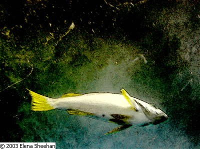 Fish Image #4 When I moved back to San Francisco in 1999, I gave up my darkroom. For many years, I had been feeling uneasy about throwing chemicals into our waters. Since I felt this way, the loss of the darkroom became less poignant. Change is always good if one can grow from it. I took up the digital camera and the digital darkroom and began working with Photoshop™. I was amazed that I really enjoyed the process. One can make images in many ways. I was still photographing subject matter that evoked a response from me. Fish are elusive as they constantly move. They are beautiful in color and context, but since they are in constant motion, it is difficult to capture their absolute likeness. Actually, I was not interested in capturing their absolute likeness. I did not photograph with flash. Instead, I went with the flow of their motion. I was happy to record the shapes and forms that they produced as they swam across my field of view. These were then transformed as they were captured by the slow shutter speed of the camera. Once again, my subject matter reflected my ongoing interest in the fleeting and transient nature of reality. - Elena Sheehan