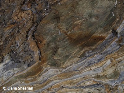 Aegean Textures Image #3 When I was Artist in Resident at the Skopelos Foundation for the Arts, I made a small hand-made book in which I related the stones and rocks in nature to their use in the various structures on the Island of Skopelos. This investigation of that relationship caused me to once again observe closely small details. Out of this close observation of the intimate detail, I became fascinated with the "designs" of the rocks. I saw there, relationships of colors and forms that evoked magical landscapes and mythological figures. Again, I was looking at reality in a way that was not preconceived and I was able to see and feel the mystery that was around me. These images are printed with permanent pigment inks on canvas and stretched (18" x 24") to enrich the sense of texture, beauty and mystery of the small detail. One of a Kind images. No Editions. - Elena Sheehan