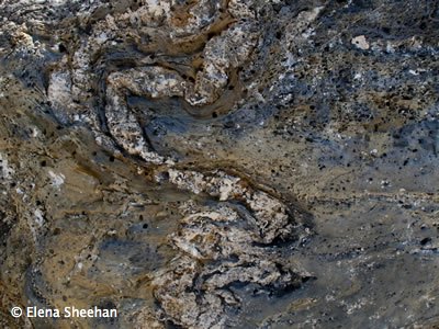 Aegean Textures Image #7 When I was Artist in Resident at the Skopelos Foundation for the Arts, I made a small hand-made book in which I related the stones and rocks in nature to their use in the various structures on the Island of Skopelos. This investigation of that relationship caused me to once again observe closely small details. Out of this close observation of the intimate detail, I became fascinated with the "designs" of the rocks. I saw there, relationships of colors and forms that evoked magical landscapes and mythological figures. Again, I was looking at reality in a way that was not preconceived and I was able to see and feel the mystery that was around me. These images are printed with permanent pigment inks on canvas and stretched (18" x 24") to enrich the sense of texture, beauty and mystery of the small detail. One of a Kind images. No Editions. - Elena Sheehan