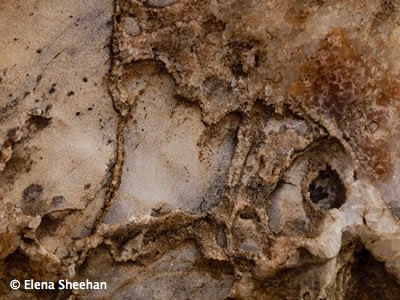 Aegean Textures Image #11 When I was Artist in Resident at the Skopelos Foundation for the Arts, I made a small hand-made book in which I related the stones and rocks in nature to their use in the various structures on the Island of Skopelos. This investigation of that relationship caused me to once again observe closely small details. Out of this close observation of the intimate detail, I became fascinated with the "designs" of the rocks. I saw there, relationships of colors and forms that evoked magical landscapes and mythological figures. Again, I was looking at reality in a way that was not preconceived and I was able to see and feel the mystery that was around me. These images are printed with permanent pigment inks on canvas and stretched (18" x 24") to enrich the sense of texture, beauty and mystery of the small detail. One of a Kind images. No Editions. - Elena Sheehan