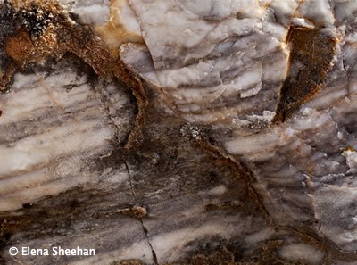 Aegean Textures Image #13 When I was Artist in Resident at the Skopelos Foundation for the Arts, I made a small hand-made book in which I related the stones and rocks in nature to their use in the various structures on the Island of Skopelos. This investigation of that relationship caused me to once again observe closely small details. Out of this close observation of the intimate detail, I became fascinated with the "designs" of the rocks. I saw there, relationships of colors and forms that evoked magical landscapes and mythological figures. Again, I was looking at reality in a way that was not preconceived and I was able to see and feel the mystery that was around me. These images are printed with permanent pigment inks on canvas and stretched (18" x 24") to enrich the sense of texture, beauty and mystery of the small detail. One of a Kind images. No Editions. - Elena Sheehan