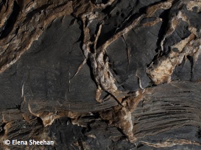 Aegean Textures Image #16 When I was Artist in Resident at the Skopelos Foundation for the Arts, I made a small hand-made book in which I related the stones and rocks in nature to their use in the various structures on the Island of Skopelos. This investigation of that relationship caused me to once again observe closely small details. Out of this close observation of the intimate detail, I became fascinated with the "designs" of the rocks. I saw there, relationships of colors and forms that evoked magical landscapes and mythological figures. Again, I was looking at reality in a way that was not preconceived and I was able to see and feel the mystery that was around me. These images are printed with permanent pigment inks on canvas and stretched (18" x 24") to enrich the sense of texture, beauty and mystery of the small detail. One of a Kind images. No Editions. - Elena Sheehan