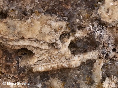 Aegean Textures Image #18 When I was Artist in Resident at the Skopelos Foundation for the Arts, I made a small hand-made book in which I related the stones and rocks in nature to their use in the various structures on the Island of Skopelos. This investigation of that relationship caused me to once again observe closely small details. Out of this close observation of the intimate detail, I became fascinated with the "designs" of the rocks. I saw there, relationships of colors and forms that evoked magical landscapes and mythological figures. Again, I was looking at reality in a way that was not preconceived and I was able to see and feel the mystery that was around me. These images are printed with permanent pigment inks on canvas and stretched (18" x 24") to enrich the sense of texture, beauty and mystery of the small detail. One of a Kind images. No Editions. - Elena Sheehan