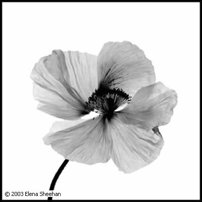 Black & White Flowers Image #31 This body of work evolved after the summer that I worked as the photographer on an archeological excavation in Greece. There, I photographed the objects that were unearthed after being buried for several millennium. I already had a personal portfolio of multiple exposure work dealing with Greek and Roman antiquities and this straight documentation of objects left me feeling lifeless. When I returned to California and my new home and to my garden, I was enchanted by the beauty of my environment. Initially I started to photograph the flowers because of their inherent grace. But as I progressed into the project, I felt that showing the flowers to be handsome was not enough. Flowers are fragile and as one handles them, they come apart. As they came apart, the parts became more than a whole. I decided to concentrate on this aspect of my subject. The placement of the flower parts creates a certain tension which then lends itself to the impression of movement. This impression of motion transforms the subject into a new an fluid reality. The flowers take on different personalities. Some are still and quiet and appear content, some are active and jumpy, others seem to sway to the tunes of the tango. The energy between the separate entities perpetuates an illusion of change. This evanescent quality of reality has always been the main subject of all my work. - Elena Sheehan