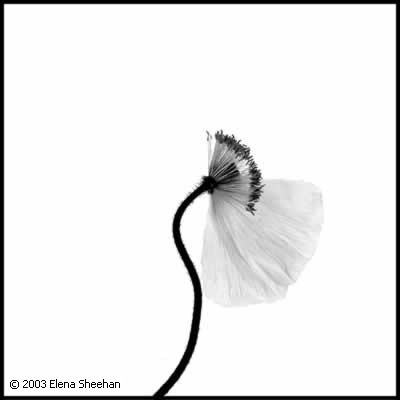 Black & White Flowers Image #32 This body of work evolved after the summer that I worked as the photographer on an archeological excavation in Greece. There, I photographed the objects that were unearthed after being buried for several millennium. I already had a personal portfolio of multiple exposure work dealing with Greek and Roman antiquities and this straight documentation of objects left me feeling lifeless. When I returned to California and my new home and to my garden, I was enchanted by the beauty of my environment. Initially I started to photograph the flowers because of their inherent grace. But as I progressed into the project, I felt that showing the flowers to be handsome was not enough. Flowers are fragile and as one handles them, they come apart. As they came apart, the parts became more than a whole. I decided to concentrate on this aspect of my subject. The placement of the flower parts creates a certain tension which then lends itself to the impression of movement. This impression of motion transforms the subject into a new an fluid reality. The flowers take on different personalities. Some are still and quiet and appear content, some are active and jumpy, others seem to sway to the tunes of the tango. The energy between the separate entities perpetuates an illusion of change. This evanescent quality of reality has always been the main subject of all my work. - Elena Sheehan