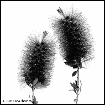 Black & White Flowers Image #33 This body of work evolved after the summer that I worked as the photographer on an archeological excavation in Greece. There, I photographed the objects that were unearthed after being buried for several millennium. I already had a personal portfolio of multiple exposure work dealing with Greek and Roman antiquities and this straight documentation of objects left me feeling lifeless. When I returned to California and my new home and to my garden, I was enchanted by the beauty of my environment. Initially I started to photograph the flowers because of their inherent grace. But as I progressed into the project, I felt that showing the flowers to be handsome was not enough. Flowers are fragile and as one handles them, they come apart. As they came apart, the parts became more than a whole. I decided to concentrate on this aspect of my subject. The placement of the flower parts creates a certain tension which then lends itself to the impression of movement. This impression of motion transforms the subject into a new an fluid reality. The flowers take on different personalities. Some are still and quiet and appear content, some are active and jumpy, others seem to sway to the tunes of the tango. The energy between the separate entities perpetuates an illusion of change. This evanescent quality of reality has always been the main subject of all my work. - Elena Sheehan