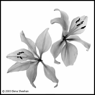 Black & White Flowers Image #37 This body of work evolved after the summer that I worked as the photographer on an archeological excavation in Greece. There, I photographed the objects that were unearthed after being buried for several millennium. I already had a personal portfolio of multiple exposure work dealing with Greek and Roman antiquities and this straight documentation of objects left me feeling lifeless. When I returned to California and my new home and to my garden, I was enchanted by the beauty of my environment. Initially I started to photograph the flowers because of their inherent grace. But as I progressed into the project, I felt that showing the flowers to be handsome was not enough. Flowers are fragile and as one handles them, they come apart. As they came apart, the parts became more than a whole. I decided to concentrate on this aspect of my subject. The placement of the flower parts creates a certain tension which then lends itself to the impression of movement. This impression of motion transforms the subject into a new an fluid reality. The flowers take on different personalities. Some are still and quiet and appear content, some are active and jumpy, others seem to sway to the tunes of the tango. The energy between the separate entities perpetuates an illusion of change. This evanescent quality of reality has always been the main subject of all my work. - Elena Sheehan