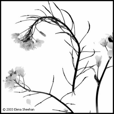 Black & White Flowers Image #7 This body of work evolved after the summer that I worked as the photographer on an archeological excavation in Greece. There, I photographed the objects that were unearthed after being buried for several millennium. I already had a personal portfolio of multiple exposure work dealing with Greek and Roman antiquities and this straight documentation of objects left me feeling lifeless. When I returned to California and my new home and to my garden, I was enchanted by the beauty of my environment. Initially I started to photograph the flowers because of their inherent grace. But as I progressed into the project, I felt that showing the flowers to be handsome was not enough. Flowers are fragile and as one handles them, they come apart. As they came apart, the parts became more than a whole. I decided to concentrate on this aspect of my subject. The placement of the flower parts creates a certain tension which then lends itself to the impression of movement. This impression of motion transforms the subject into a new an fluid reality. The flowers take on different personalities. Some are still and quiet and appear content, some are active and jumpy, others seem to sway to the tunes of the tango. The energy between the separate entities perpetuates an illusion of change. This evanescent quality of reality has always been the main subject of all my work. - Elena Sheehan