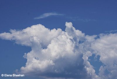 Clouds (Series) Image #2 These images of Clouds extends further my interest in the ephemeral aspect of all matter. Rock formations change slowly over time. Clouds, as water, take on forms that can change instantly. The beauty of the white clouds against the blue sky in Greece caught my imagination and fancy. Fast shutter speed and a small aperture opening are imperative in order to make a sharp image of a cloud floating miles away in the sky. With this close attention one learns to appreciate all aspects of the magic that surrounds us. These images are one of a kind. Printed on Archival Photo Paper with Archival Pigment Inks on paper size 22" x 28". - Elena Sheehan