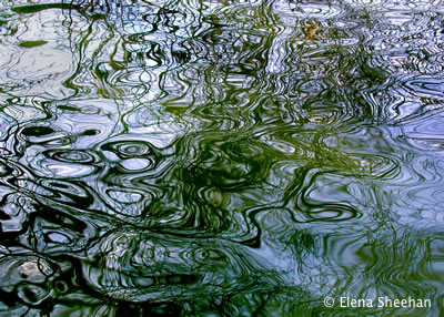 Ephemera Image #9 I am drawn to the fluctuating forms of water. The quality of light and reflections can make water appear dark, deep, melancholy, somber, stagnate or even dead. Water can also be luminous, sweet, playful, vibrant, effervescent, scintillating, turbulent, transparent and still. These forms mirror all aspects of life with its ever-changing nature. Archival Pigment Prints 18" x 24" Editions of two. - Elena Sheehan