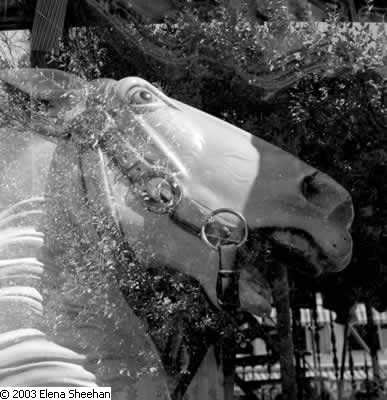 Multiple Exposure Series "Rocking Horse Winner" In photography time is used to present a reality. But this reality is not presented as the mind ordinarily perceives it. Time seems to stop so that the mind can examine more closely something that it thinks it has seen. But actually, since time is frozen into a still and unique image, a new reality is created. This blending and layering of time and space is what interests me about photography. For the past several years I have been more and more interested in how images work together. I explored this interest in my book, Journey Through Seven Circles, by arranging the images into meaningful time sequences. I have also worked with photographic collage. More recently, I have put images together by layering one on top of the other directly onto a single negative. This use of multiple exposure to create a unique image is not a new process. In the 1920's Man Ray, Moholy-Nagy, Serge Eisenstein and many of the Cubists painters created new and poetic images by incorporating ideas of layering and the use of montage. I photograph in spaces that somehow evoke a response from me. In these spaces I feel free to transform the visual reality of the everyday world into images that evoke the dreamlike world of the unconscious. There is no single interpretation for these images. Every viewer will bring their own imagination and experience to play in viewing the work. [35 images total] - Elena Sheehan