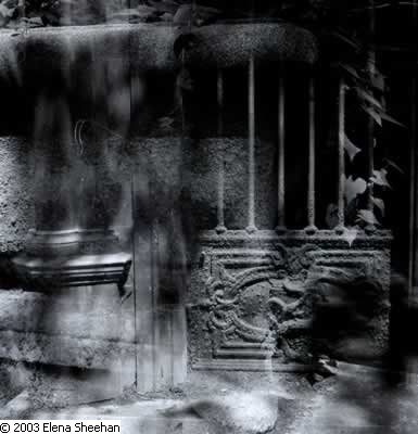 Multiple Exposure Series "Pere LaChaise" In photography time is used to present a reality. But this reality is not presented as the mind ordinarily perceives it. Time seems to stop so that the mind can examine more closely something that it thinks it has seen. But actually, since time is frozen into a still and unique image, a new reality is created. This blending and layering of time and space is what interests me about photography. For the past several years I have been more and more interested in how images work together. I explored this interest in my book, Journey Through Seven Circles, by arranging the images into meaningful time sequences. I have also worked with photographic collage. More recently, I have put images together by layering one on top of the other directly onto a single negative. This use of multiple exposure to create a unique image is not a new process. In the 1920's Man Ray, Moholy-Nagy, Serge Eisenstein and many of the Cubists painters created new and poetic images by incorporating ideas of layering and the use of montage. I photograph in spaces that somehow evoke a response from me. In these spaces I feel free to transform the visual reality of the everyday world into images that evoke the dreamlike world of the unconscious. There is no single interpretation for these images. Every viewer will bring their own imagination and experience to play in viewing the work. [35 images total] - Elena Sheehan