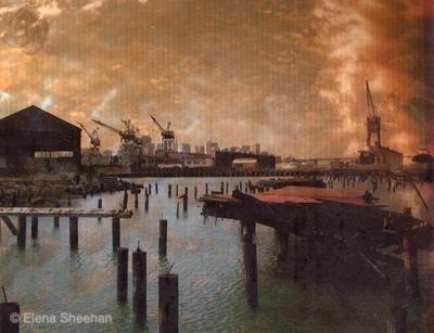 Shadows of the Past Image #10 In 2005, a friend directed me to Pier 70, which was being dismantled. He knew I would be interested in the area, even though it was not the kind of subject matter that usually appealed to me. I photographed that area for several years, and then I presented my work to the Port Commission. They put me on their mailing list and invited me to all the guided excursions to the fenced-off areas of Port 70. I had a box full of pictures of that area but never got around to trying to show the work, since it was not my usual "personal and intimate" subject matter. Recently I pulled out the box of Pier 70 pictures and decided to put them to use in some new way. I printed color transparencies of some of my nature images and layered them over the original Pier 70 pictures. I was amazed at how the layering transformed the original images. The added bit of nature (water, clouds, sky, grasses) gave the static pictures of decay a new life. I felt the pictures were in flux and changing before my eyes. We all hear a lot about climate change and how it is affecting everything and everyone. I had just finished reading The Sixth Extinction by Elizabeth Kolbert and felt my pictures were both shadows of the past and reflections of the present. Images are sequenced and printed into a book, Shadows of the Past. - Elena Sheehan