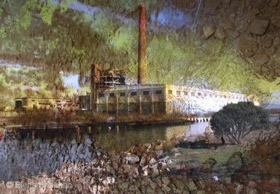 Shadows of the Past Image #11 In 2005, a friend directed me to Pier 70, which was being dismantled. He knew I would be interested in the area, even though it was not the kind of subject matter that usually appealed to me. I photographed that area for several years, and then I presented my work to the Port Commission. They put me on their mailing list and invited me to all the guided excursions to the fenced-off areas of Port 70. I had a box full of pictures of that area but never got around to trying to show the work, since it was not my usual "personal and intimate" subject matter. Recently I pulled out the box of Pier 70 pictures and decided to put them to use in some new way. I printed color transparencies of some of my nature images and layered them over the original Pier 70 pictures. I was amazed at how the layering transformed the original images. The added bit of nature (water, clouds, sky, grasses) gave the static pictures of decay a new life. I felt the pictures were in flux and changing before my eyes. We all hear a lot about climate change and how it is affecting everything and everyone. I had just finished reading The Sixth Extinction by Elizabeth Kolbert and felt my pictures were both shadows of the past and reflections of the present. Images are sequenced and printed into a book, Shadows of the Past. - Elena Sheehan