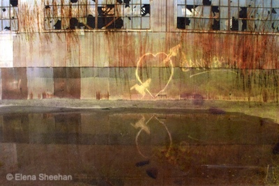 Shadows of the Past Image #12 In 2005, a friend directed me to Pier 70, which was being dismantled. He knew I would be interested in the area, even though it was not the kind of subject matter that usually appealed to me. I photographed that area for several years, and then I presented my work to the Port Commission. They put me on their mailing list and invited me to all the guided excursions to the fenced-off areas of Port 70. I had a box full of pictures of that area but never got around to trying to show the work, since it was not my usual "personal and intimate" subject matter. Recently I pulled out the box of Pier 70 pictures and decided to put them to use in some new way. I printed color transparencies of some of my nature images and layered them over the original Pier 70 pictures. I was amazed at how the layering transformed the original images. The added bit of nature (water, clouds, sky, grasses) gave the static pictures of decay a new life. I felt the pictures were in flux and changing before my eyes. We all hear a lot about climate change and how it is affecting everything and everyone. I had just finished reading The Sixth Extinction by Elizabeth Kolbert and felt my pictures were both shadows of the past and reflections of the present. Images are sequenced and printed into a book, Shadows of the Past. - Elena Sheehan