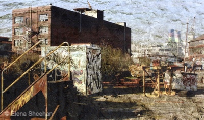 Shadows of the Past Image #18 In 2005, a friend directed me to Pier 70, which was being dismantled. He knew I would be interested in the area, even though it was not the kind of subject matter that usually appealed to me. I photographed that area for several years, and then I presented my work to the Port Commission. They put me on their mailing list and invited me to all the guided excursions to the fenced-off areas of Port 70. I had a box full of pictures of that area but never got around to trying to show the work, since it was not my usual "personal and intimate" subject matter. Recently I pulled out the box of Pier 70 pictures and decided to put them to use in some new way. I printed color transparencies of some of my nature images and layered them over the original Pier 70 pictures. I was amazed at how the layering transformed the original images. The added bit of nature (water, clouds, sky, grasses) gave the static pictures of decay a new life. I felt the pictures were in flux and changing before my eyes. We all hear a lot about climate change and how it is affecting everything and everyone. I had just finished reading The Sixth Extinction by Elizabeth Kolbert and felt my pictures were both shadows of the past and reflections of the present. Images are sequenced and printed into a book, Shadows of the Past. - Elena Sheehan