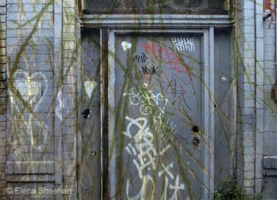 Shadows of the Past Image #25 In 2005, a friend directed me to Pier 70, which was being dismantled. He knew I would be interested in the area, even though it was not the kind of subject matter that usually appealed to me. I photographed that area for several years, and then I presented my work to the Port Commission. They put me on their mailing list and invited me to all the guided excursions to the fenced-off areas of Port 70. I had a box full of pictures of that area but never got around to trying to show the work, since it was not my usual "personal and intimate" subject matter. Recently I pulled out the box of Pier 70 pictures and decided to put them to use in some new way. I printed color transparencies of some of my nature images and layered them over the original Pier 70 pictures. I was amazed at how the layering transformed the original images. The added bit of nature (water, clouds, sky, grasses) gave the static pictures of decay a new life. I felt the pictures were in flux and changing before my eyes. We all hear a lot about climate change and how it is affecting everything and everyone. I had just finished reading The Sixth Extinction by Elizabeth Kolbert and felt my pictures were both shadows of the past and reflections of the present. Images are sequenced and printed into a book, Shadows of the Past. - Elena Sheehan