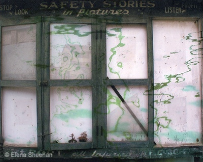 Shadows of the Past Image #26 In 2005, a friend directed me to Pier 70, which was being dismantled. He knew I would be interested in the area, even though it was not the kind of subject matter that usually appealed to me. I photographed that area for several years, and then I presented my work to the Port Commission. They put me on their mailing list and invited me to all the guided excursions to the fenced-off areas of Port 70. I had a box full of pictures of that area but never got around to trying to show the work, since it was not my usual "personal and intimate" subject matter. Recently I pulled out the box of Pier 70 pictures and decided to put them to use in some new way. I printed color transparencies of some of my nature images and layered them over the original Pier 70 pictures. I was amazed at how the layering transformed the original images. The added bit of nature (water, clouds, sky, grasses) gave the static pictures of decay a new life. I felt the pictures were in flux and changing before my eyes. We all hear a lot about climate change and how it is affecting everything and everyone. I had just finished reading The Sixth Extinction by Elizabeth Kolbert and felt my pictures were both shadows of the past and reflections of the present. Images are sequenced and printed into a book, Shadows of the Past. - Elena Sheehan