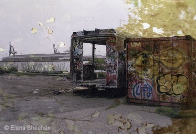 Shadows of the Past Image #6 In 2005, a friend directed me to Pier 70, which was being dismantled. He knew I would be interested in the area, even though it was not the kind of subject matter that usually appealed to me. I photographed that area for several years, and then I presented my work to the Port Commission. They put me on their mailing list and invited me to all the guided excursions to the fenced-off areas of Port 70. I had a box full of pictures of that area but never got around to trying to show the work, since it was not my usual "personal and intimate" subject matter. Recently I pulled out the box of Pier 70 pictures and decided to put them to use in some new way. I printed color transparencies of some of my nature images and layered them over the original Pier 70 pictures. I was amazed at how the layering transformed the original images. The added bit of nature (water, clouds, sky, grasses) gave the static pictures of decay a new life. I felt the pictures were in flux and changing before my eyes. We all hear a lot about climate change and how it is affecting everything and everyone. I had just finished reading The Sixth Extinction by Elizabeth Kolbert and felt my pictures were both shadows of the past and reflections of the present. Images are sequenced and printed into a book, Shadows of the Past. - Elena Sheehan