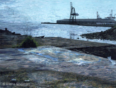 Shadows of the Past Image #8 In 2005, a friend directed me to Pier 70, which was being dismantled. He knew I would be interested in the area, even though it was not the kind of subject matter that usually appealed to me. I photographed that area for several years, and then I presented my work to the Port Commission. They put me on their mailing list and invited me to all the guided excursions to the fenced-off areas of Port 70. I had a box full of pictures of that area but never got around to trying to show the work, since it was not my usual "personal and intimate" subject matter. Recently I pulled out the box of Pier 70 pictures and decided to put them to use in some new way. I printed color transparencies of some of my nature images and layered them over the original Pier 70 pictures. I was amazed at how the layering transformed the original images. The added bit of nature (water, clouds, sky, grasses) gave the static pictures of decay a new life. I felt the pictures were in flux and changing before my eyes. We all hear a lot about climate change and how it is affecting everything and everyone. I had just finished reading The Sixth Extinction by Elizabeth Kolbert and felt my pictures were both shadows of the past and reflections of the present. Images are sequenced and printed into a book, Shadows of the Past. - Elena Sheehan