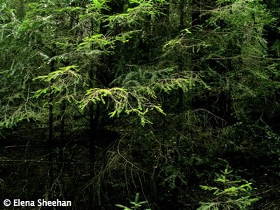 Trees Series Image #16 These pictures of trees are not about specific trees in a specific place. Rather my interests, as in all my work, is about the spirit of the subject as it is affected by the elements. The project began slowly and without a specific intent. As I traveled and hiked, my eyes opened to the subtle nuances of the beautiful shapes of nature. I was drawn to the mystery that is created when motion caused by the wind blowing the trees creates unpredictable forms. That uncertainty along with the magic that light can affect became important to me. Once again the evanescent quality of reality became my main subject. - Elena Sheehan